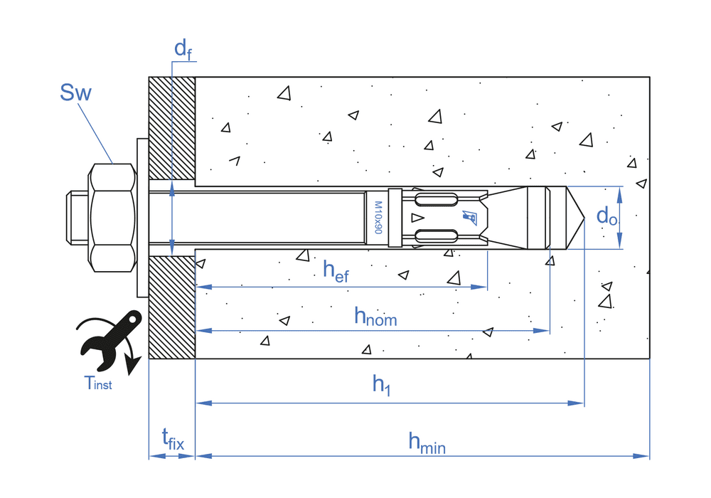 tfix - Dicke des Anbauteils 3 SW - Schlüsselweite 17 df - Ø Durchgangsbohrung im Anbauteil 12 Tins - Montagedrehmoment (Nm) 35 hef - Effektive Verankerungstiefe 42 hnom - Gesamtlänge des Ankers im Beton 54 h1 - Min. Bohrlochtiefe 60 d0 - Ø Bohrdurchmesser 10 hmin - Min. Dicke des Anbauteils 100 L - Länge 70 MI10090 M10 x 90 Ø10 10 110 E 0 100 400 8423533019806