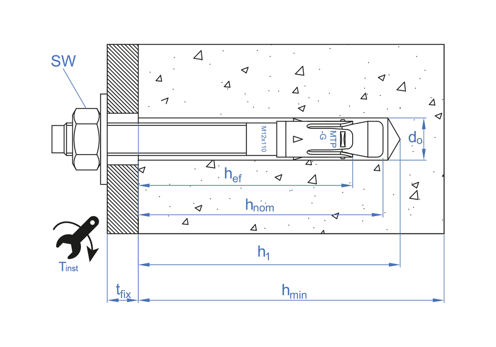 tfix - Dicke des Anbauteils 5 SW - Schlüsselweite 17 df - Ø Durchgangsbohrung im Anbauteil 12 Tins - Montagedrehmoment (Nm) 40 hef - Effektive Verankerungstiefe 45 hnom - Gesamtlänge des Ankers im Beton 53 h1 - Min. Bohrlochtiefe 60 d0 - Ø Bohrdurchmesser 10 hmin - Min. Dicke des Anbauteils 100 L - Länge 70 APG10090 M10 x 90 Ø10 10 120 E 0 100 400 8423533725479