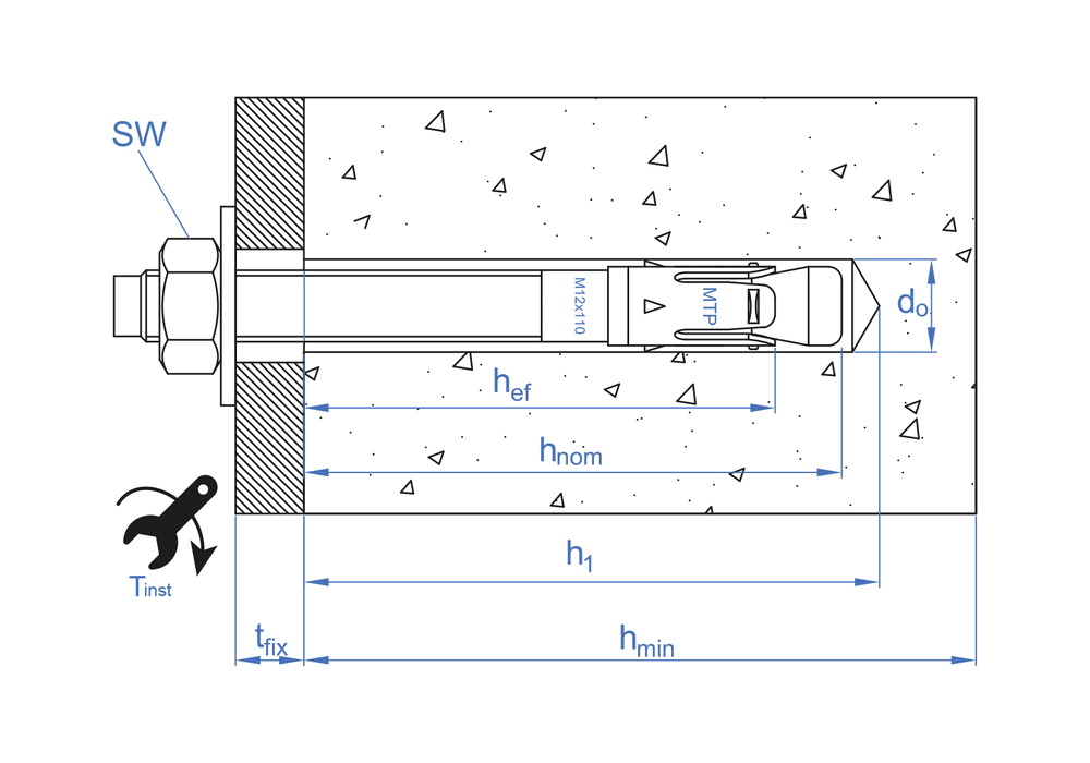tfix - Dicke des Anbauteils 10 SW - Schlüsselweite 17 df - Ø Durchgangsbohrung im Anbauteil 12 Tins - Montagedrehmoment (Nm) 40 hef - Effektive Verankerungstiefe 60 hnom - Gesamtlänge des Ankers im Beton 68 h1 - Min. Bohrlochtiefe 75 d0 - Ø Bohrdurchmesser 10 hmin - Min. Dicke des Anbauteils 120 L - Länge 90 APAT10105 M10 x 105 Ø10 25 120 F 0 50 300 8423533896568