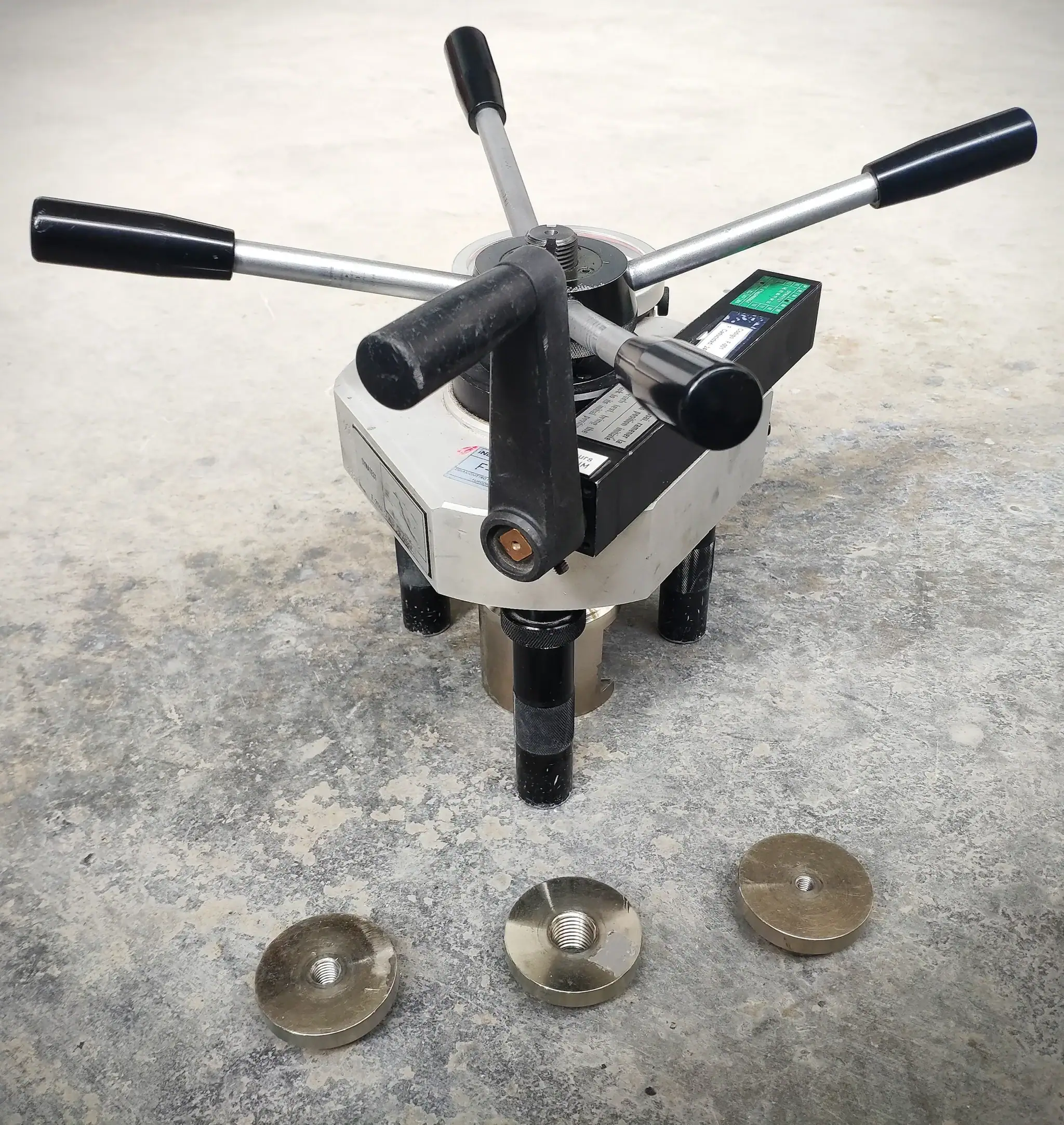 - The load application is achieved via a ratchet handle driving a 4:1 hydraulic multiplier; the applied load is recorded directly on a gauge mounted on the tester body. This compact design is lighter and more convenient to use than that of separate hydraulic pump and ram arrangements.