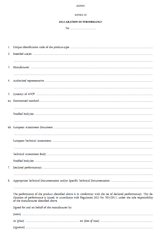 The Declaration of Performance, which confirms the performance of the product in terms of its essential characteristics, will be issued by the manufacturer when the product is placed on the market and is covered by a harmonised standard or complies with a European Technical Assessment (if the manufacturer has followed this procedure), thereby assuming responsibility that the product conforms with the declared performance.