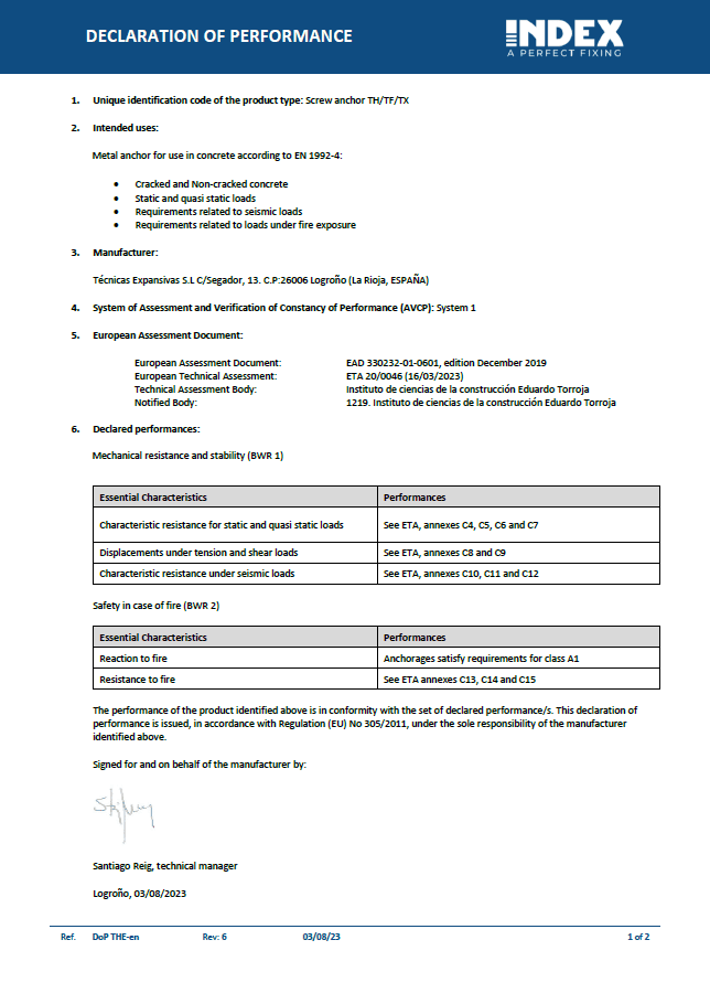 An example of the content of the Declaration of Performance according to the European Construction Products Regulation is attached in the annex, as well as a real case. The Declarations of Performance for INDEX products can be downloaded from our website, in the “documentation” section of the corresponding product.