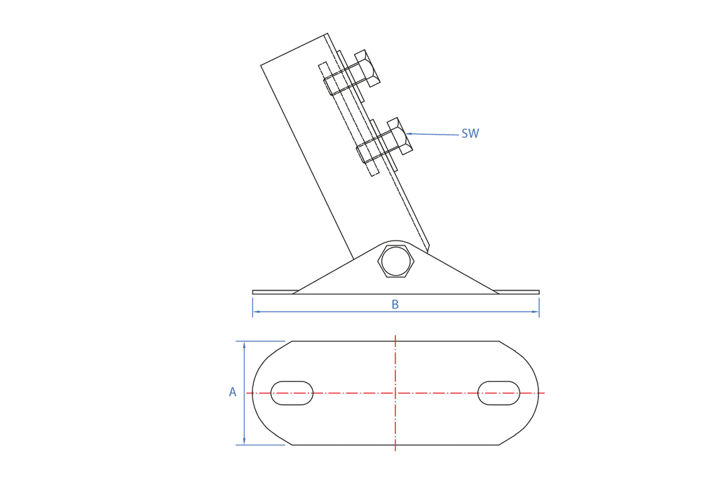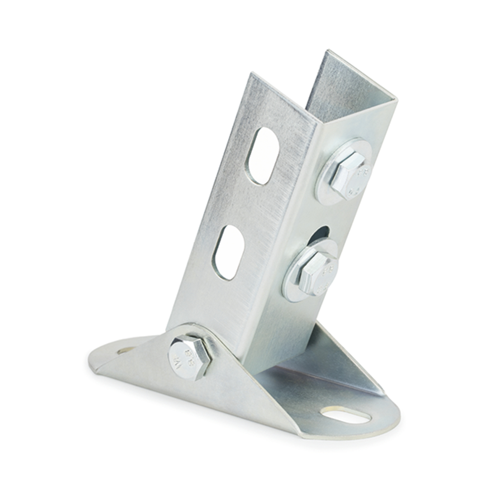 Adjustable support, designed to fix Indextrut profiles for heavy loads to walls or floors. Its articulated structure allows the position of the profile to be adjusted according to the needs of the installation. It can be used to install elements such as pipe clamps or cable trays. It is made of zinc-coated steel.