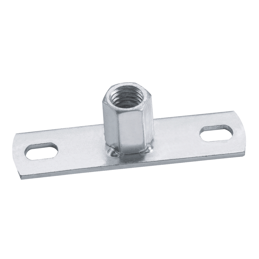 Plate for mounting threaded rods. It has a female metric thread for connecting the rod and two holes for fixing it to ceilings or other structures. It can be used to install suspended ceilings or pipe systems. It is made of zinc-coated steel.
