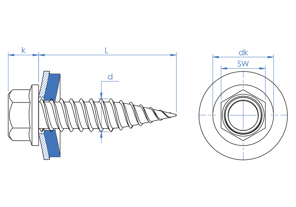 Self-tapping screw with hexagonal head and stainless steel and EPDM washer. Allows the fastening of aluminium profiles and perforated guides on metal roofs in the assembly of structures for solar panels. It drills and fixes simultaneously in a quick and easy way. The tip is made of hardened steel and the body is made of A2 stainless steel. It is coated with Atlantis C4-M.