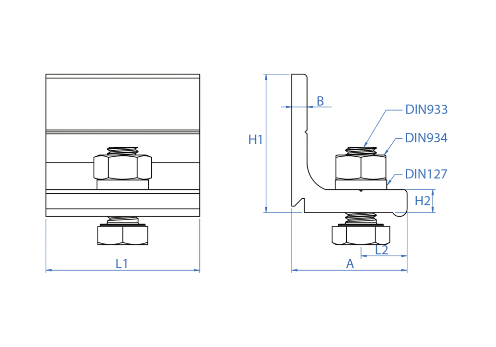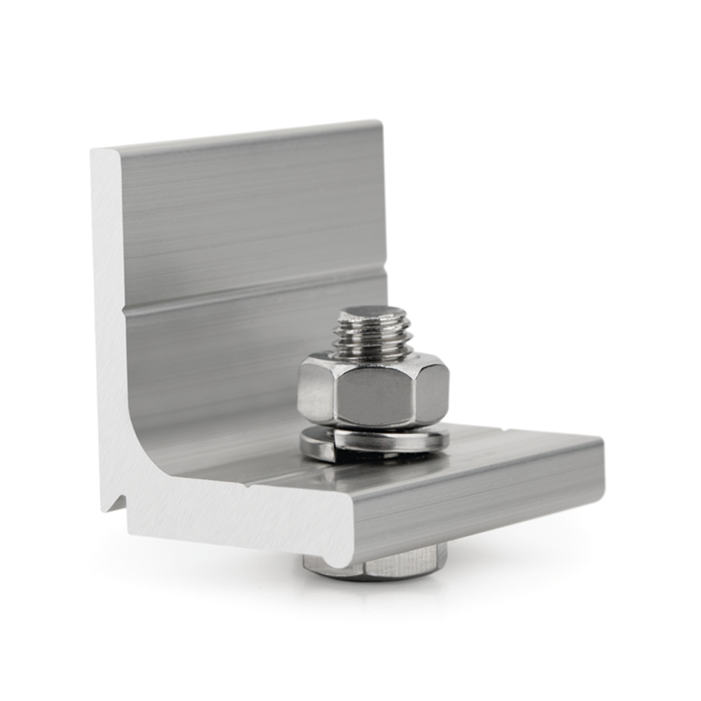 Connector for joining aluminium profiles on triangles when mounting solar panels. Attaches to the side walls of the profile. Can be used with PSE-A profiles. Consists of an aluminium profile and a DIN 933 screw, a DIN 127 washer and a DIN 934 nut made of A2 stainless steel.