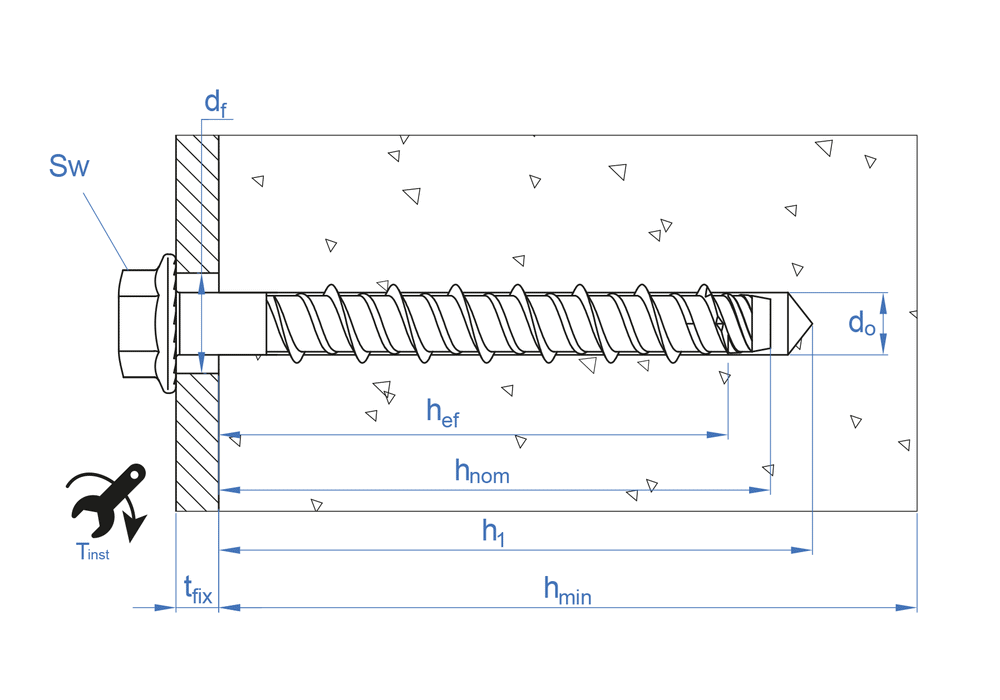 tfix - Épaisseur max. à fixer 60 SW - Schlüsselweite 24 df - Ø Élément à fixer 22 Tins - Tins - 90 hnom - Min. profondeur cheville 140 h1 - Profondeur min. de perçade 160 d0 - Ø Foret 18 hmin - Min. épaisseur du support 225 L - Longueur 200