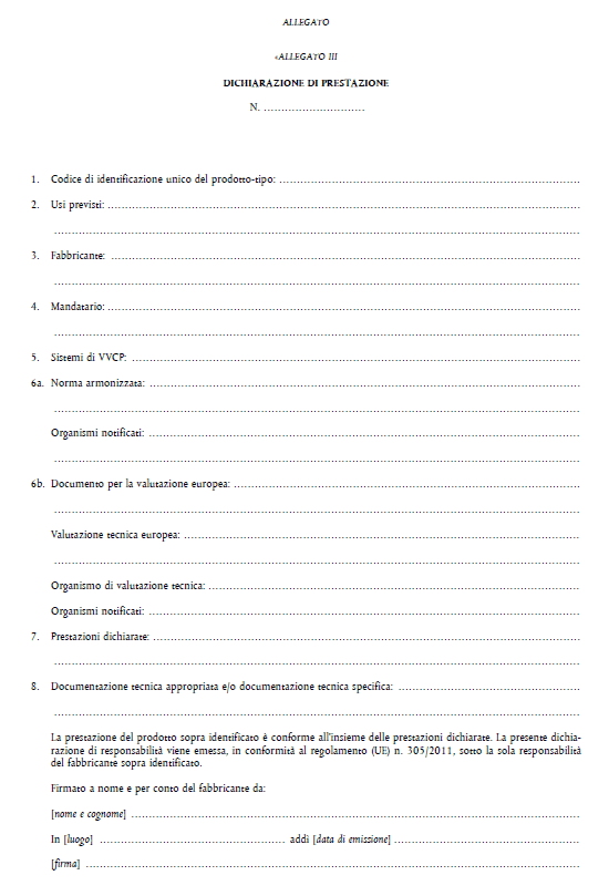 Una copia della Dichiarazione di Prestazione deve essere consegnata dal produttore o, se del caso, dal distributore o importatore, al destinatario del prodotto o di un lotto del prodotto, su carta o in formato elettronico. In alternativa, è possibile rendere disponibile una copia della dichiarazione di prestazione informando il destinatario del prodotto che la stessa può essere consultata sul sito web del produttore, del distributore o dell’importatore.