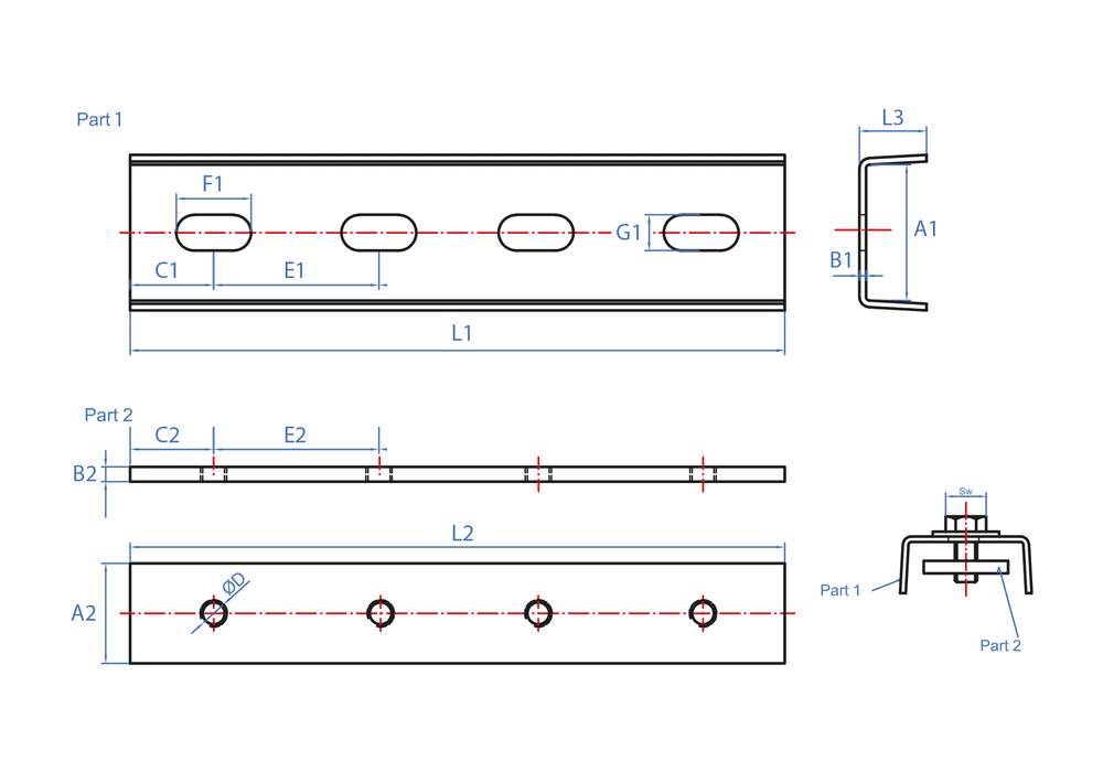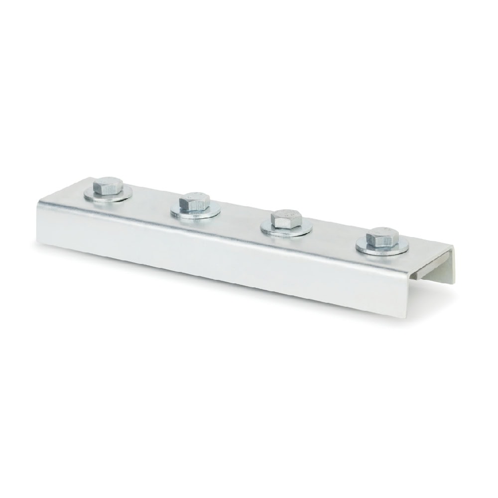 Raccordo per guide Indextrut. Permette di unire due profili in orizzontale durante il montaggio di strutture. Include viti esagonali e dadi per il collegamento dei profili. Il suo design a forma di “U” garantisce un fissaggio resistente e sicuro. È fatto di acciaio con rivestimento zincato.