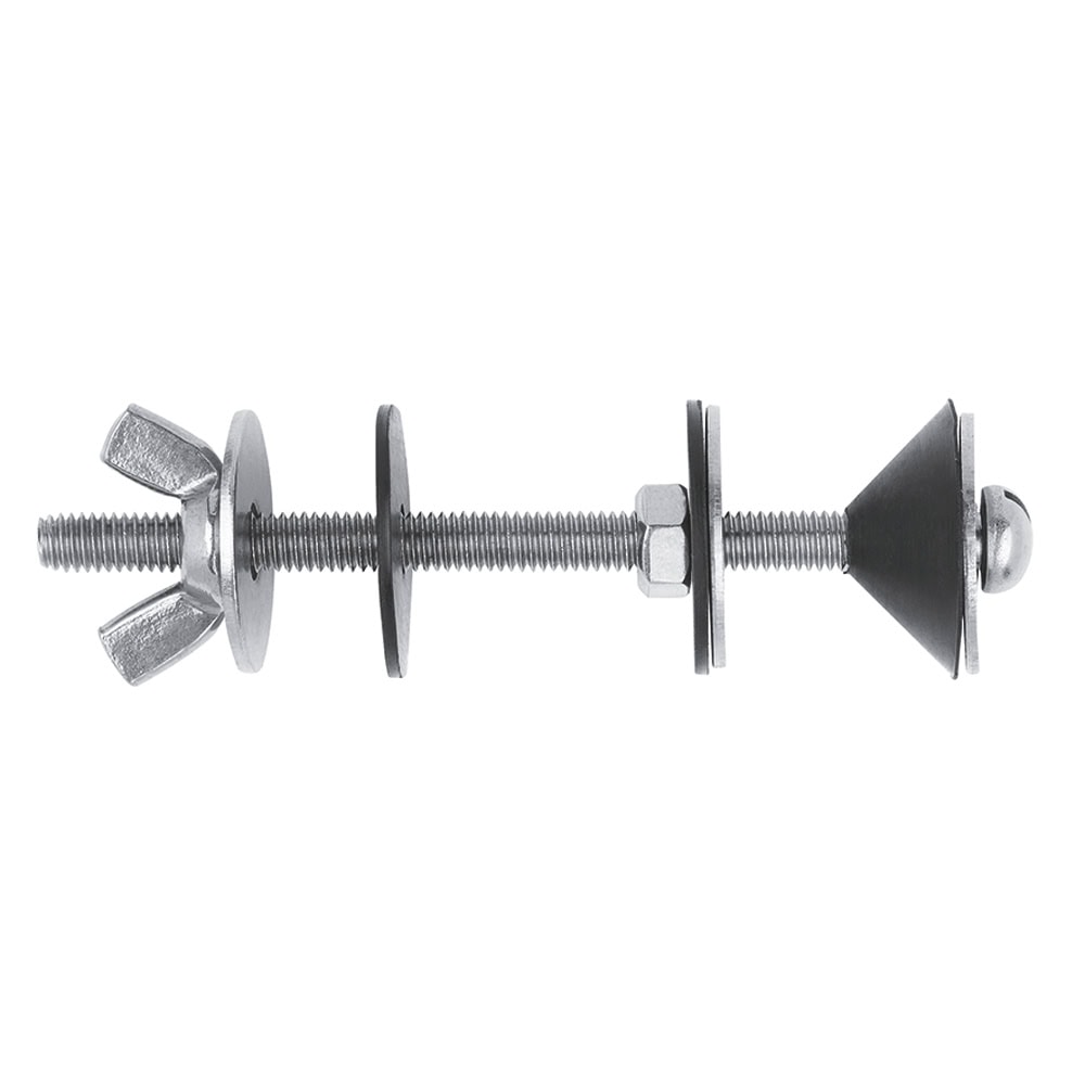 Kit di fissaggio per fissare la cassetta di scarico al WC. Include due viti in acciaio inossidabile; due rondelle in acciaio zincato; due rondelle e due coni in gomma; due dadi esagonali e due dadi a farfalla in acciaio zincato. Assicura un fissaggio resistente e a tenuta stagna della cassetta di scarico, riducendo al minimo il rischio di perdite.