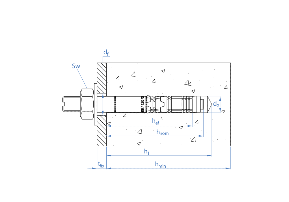 tfix - Spessore max da fissare 160 SW - Chiave di installazione 30 df - Ø Elemento da bloccare 31 Tins - Coppia di serraggio (Nm) 240 hef - Profondità effettiva 125 hnom - Profondità min. dell'ancoraggio 146 h1 - Profondità min. di perforazione 160 d0 - Punta da trapano Ø 28 hmin - Spessore min. del materiale di base 250 L - Lunghezza 310