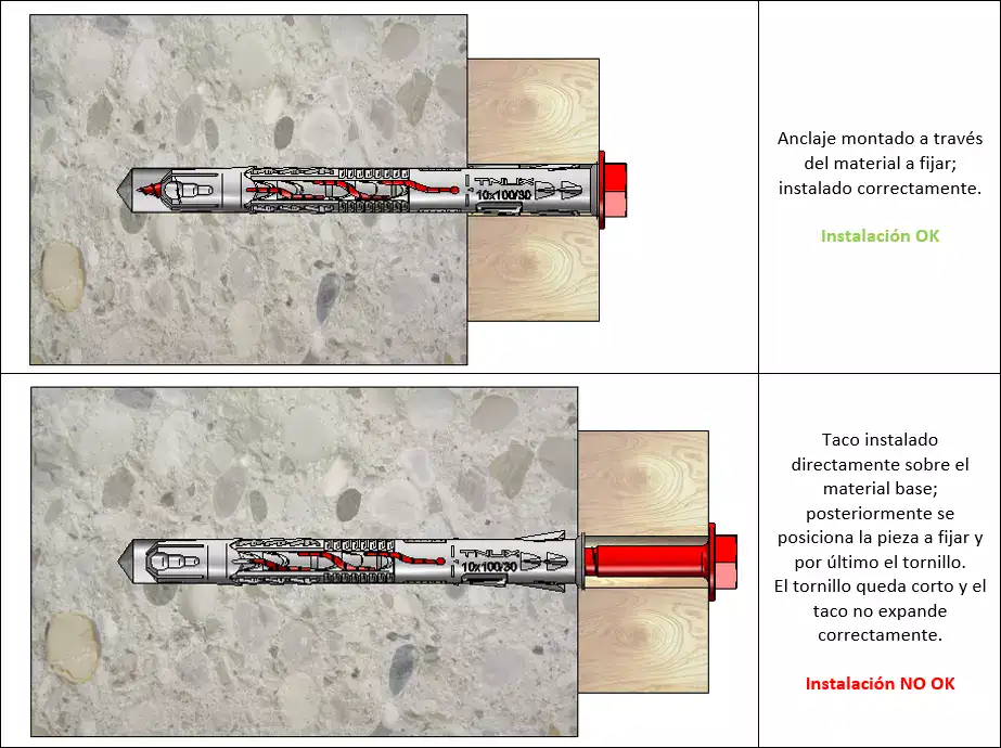 En las siguientes imágenes se muestra el anclaje instalado correctamente, con montaje a través del material a fijar: