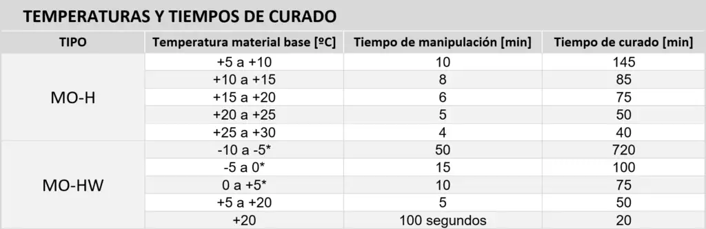 La duración de este tiempo dependerá directamente de la temperatura del material base. Como ejemplo ver la tabla de los productos MO-H y MO-HW en la tabla. - Tiempo de curado: es el tiempo necesario para que se complete la reacción química y se alcance la resistencia nominal de la fijación. Como todas las reacciones químicas, la velocidad de reacción depende de la temperatura: mayores tiempos de curado a bajas temperaturas y menores tiempos a altas temperaturas.