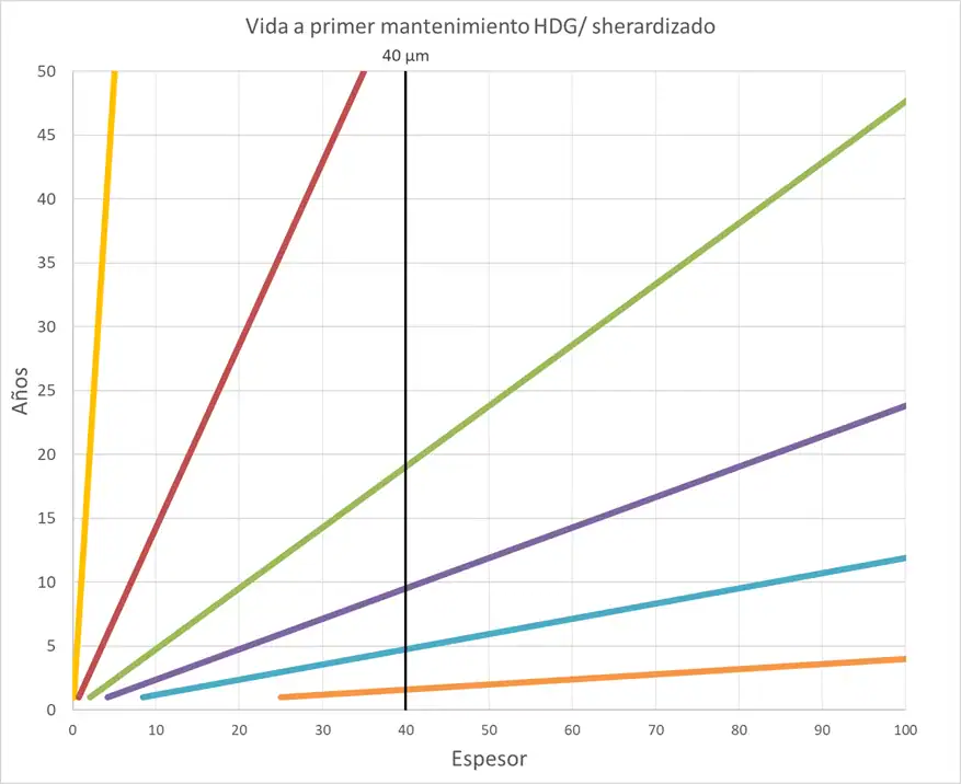 Otra alternativa para predecir la vida útil de los recubrimientos cincados, incluidos los galvanizados en caliente / sherardizados, es utilizar la velocidad de corrosión estimada en diferentes categorías de corrosividad (C1 a CX) según la tabla 4 de la norma ISO 9223 «Corrosión de los metales y aleaciones. Corrosividad de atmósferas. Clasificación». Dicha velocidad, que se resume en el siguiente gráfico, depende del espesor del revestimiento y de la clase de corrosión ambiental.