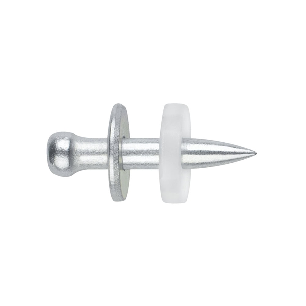 Clavos para la pistola a pólvora FP12GUN y otros modelos de calibre 12 mm. Están diseñados para afrontar fijaciones sobre superficies de hormigón y hormigón armado. Cuentan con dos arandelas, una metálica y otra plástica. La arendela plástica contribuye a amortiguar el golpe de la fijación. Están fabricados en acero zincado.