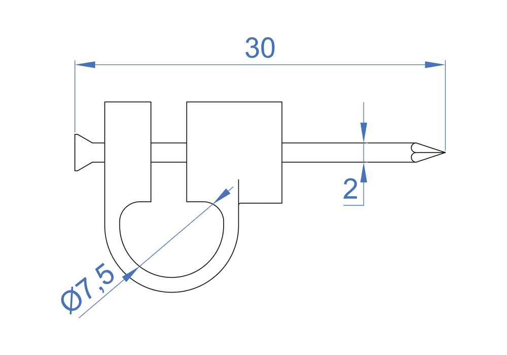 Grapa para fijar cables de TV sobre distintos tipos de superficies. Cuenta con un clavo de acero zincado y se instala mediante golpe de martillo. Está fabricada en polietileno y no cuenta con halógenos.