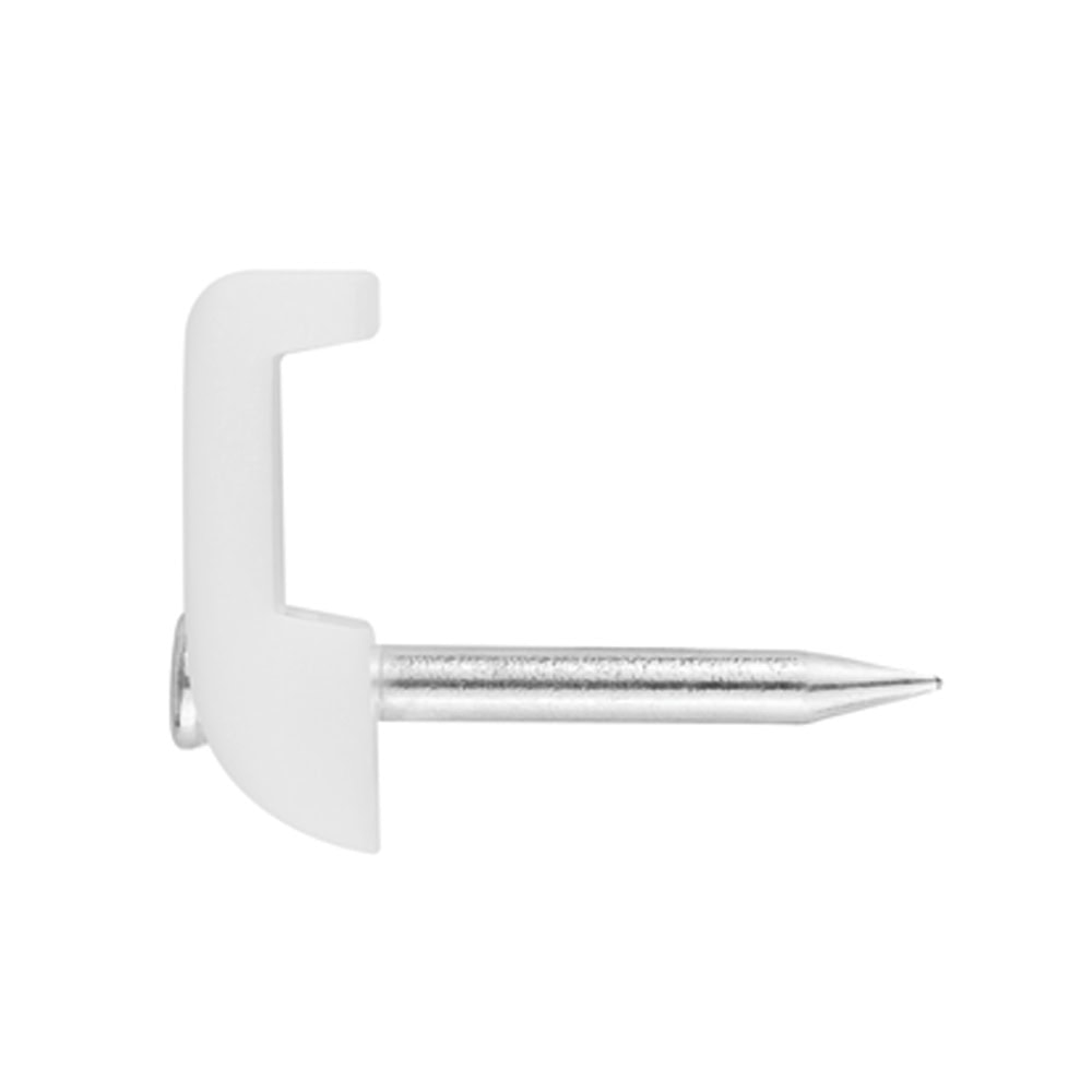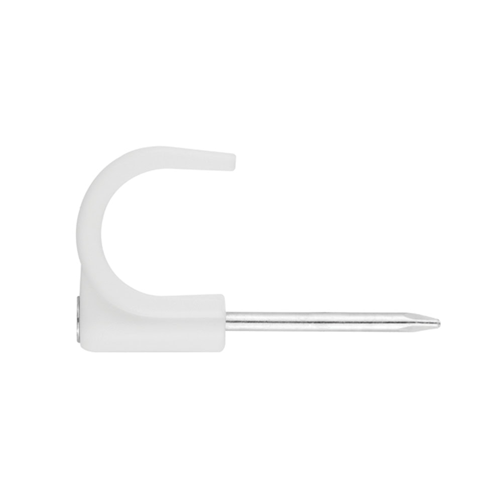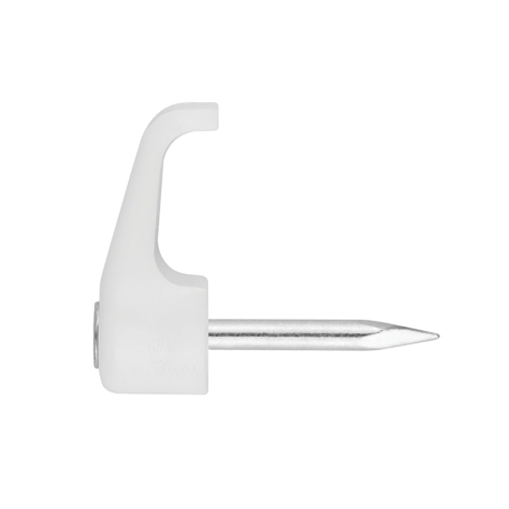 Grapa para cables de color blanco, diseñada para la fijación de cables o tubos de plástico sobre diferentes superficies. Incorpora un clavo de acero zincado para su instalación por golpeo. Está disponible en distintos formatos, adaptados a cables planos, redondos y a montajes en paralelo. Está fabricada en polietileno y no cuenta con halógenos.