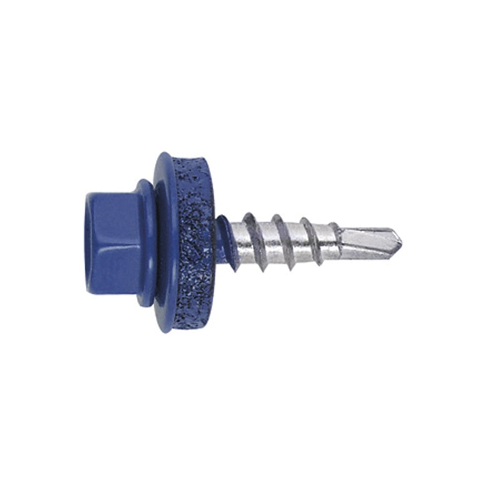 Tornillo con cabeza hexagonal y arandela estampada para unir chapas metálicas a madera. Se puede emplear en el montaje de cubiertas metálicas sobre estructuras de madera. Cuenta con una rosca para metal de 60º y una punta de tipo broca, que permite taladrar directamente el material. Esfá fabricado en acero zincado. La cabeza y la arandela están lacadas en color azul genciana (RAL 5010).