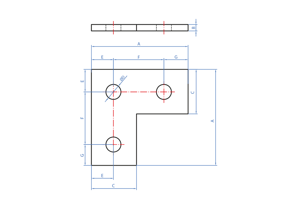 Pieza de unión en forma de escuadra para guías Indextrut. Permite la conexión de dos guías perforadas en perpendicular. Su diseño incorpora tres agujeros para la unión de los perfiles mediante tornillos hexagonales y tuercas. Está fabricada en acero con recubrimiento zincado.