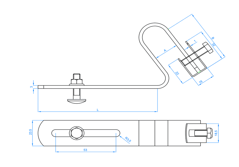 Soporte para instalar canalones en cubiertas de teja. Permite fijar a las tejas ganchos o módulos para la soportación de canalones. La unión con los accesorios de fijación se realiza mediante un tornillo DIN-603 y una tuerca con arandela estampada. Está fabricado en acero con recubrimiento zincado.