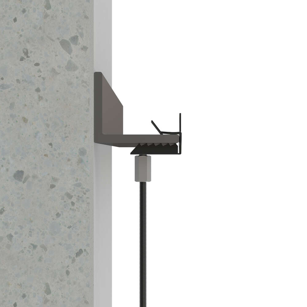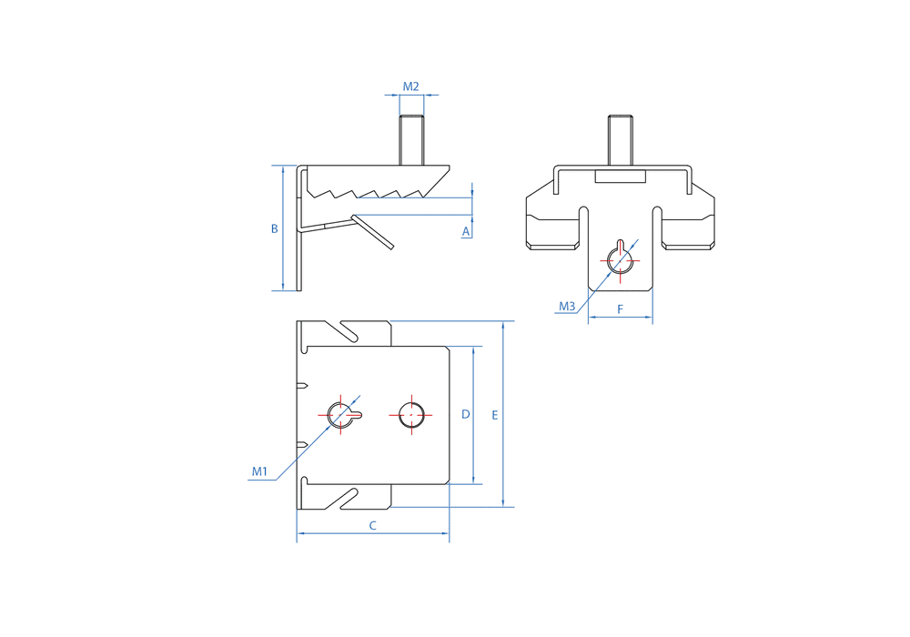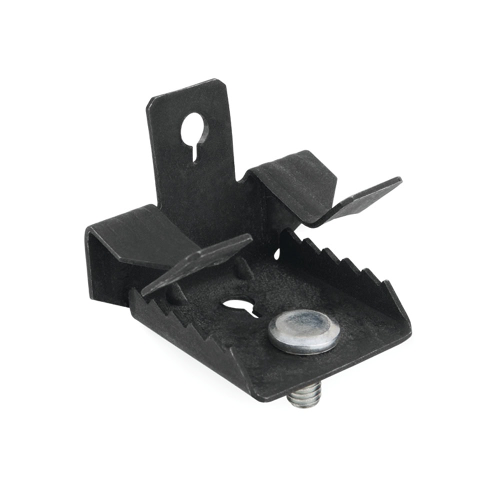Clip para vigas con tornillo. Permite fijar abrazaderas o conectores para varillas roscadas a perfiles metálicos de forma rápida y segura. Cuenta con dos agujeros M6 para la conexión directa de varillas roscadas. Se puede instalar con un martillo, sin necesidad de soldar o hacer agujeros en la superficie de la viga. Está fabricado en acero fosfatado.