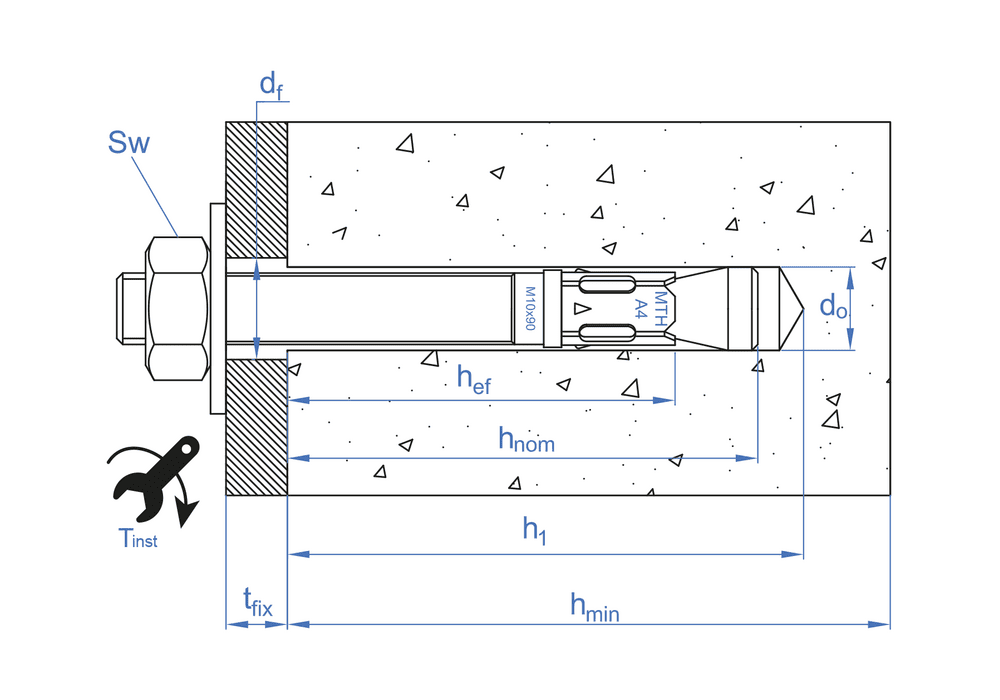 tfix - Espessura máx. a fixar 13 SW - Chave para instalação 17 df - Ø Elemento a fixar 12 Tins - Par de aperto (Nm) 35 hef - Profundidade efetiva 42 hnom - Profundidade min. de instalação 54 h1 - Profundidade min. do furo 60 d0 - Ø Broca 10 hmin - Espessura min. do material base 100 L - Comprimento 80 MIA410090 M10 x 90 Ø10 10 110 E 0 100 400 8423533087706