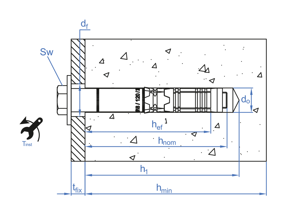 tfix - Espessura máx. a fixar 25 SW - Chave para instalação 13 df - Ø Elemento a fixar 14 Tins - Par de aperto (Nm) 30 hef - Profundidade efetiva 60 hnom - Profundidade min. de instalação 72 h1 - Profundidade min. do furo 85 d0 - Ø Broca 12 hmin - Espessura min. do material base 120 L - Comprimento 100 SLPT12120 M8 x 120 Ø12 45 120 0 25 200 8423533827821