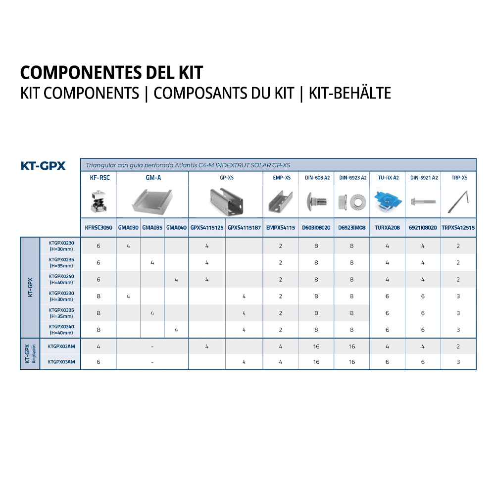 | Código | Tipo Kit | Nº Módulos | C Placa [mm] | Inclinação | Uni. vendas mín. | Uds Caixa | Uds. Masterbox | EAN | Info. Técnica |