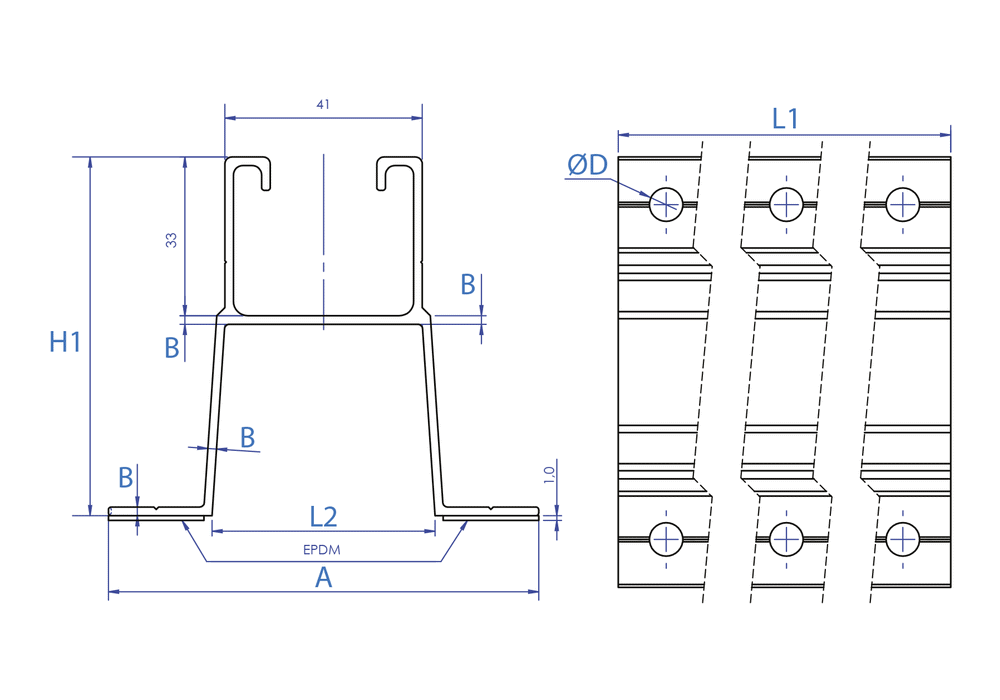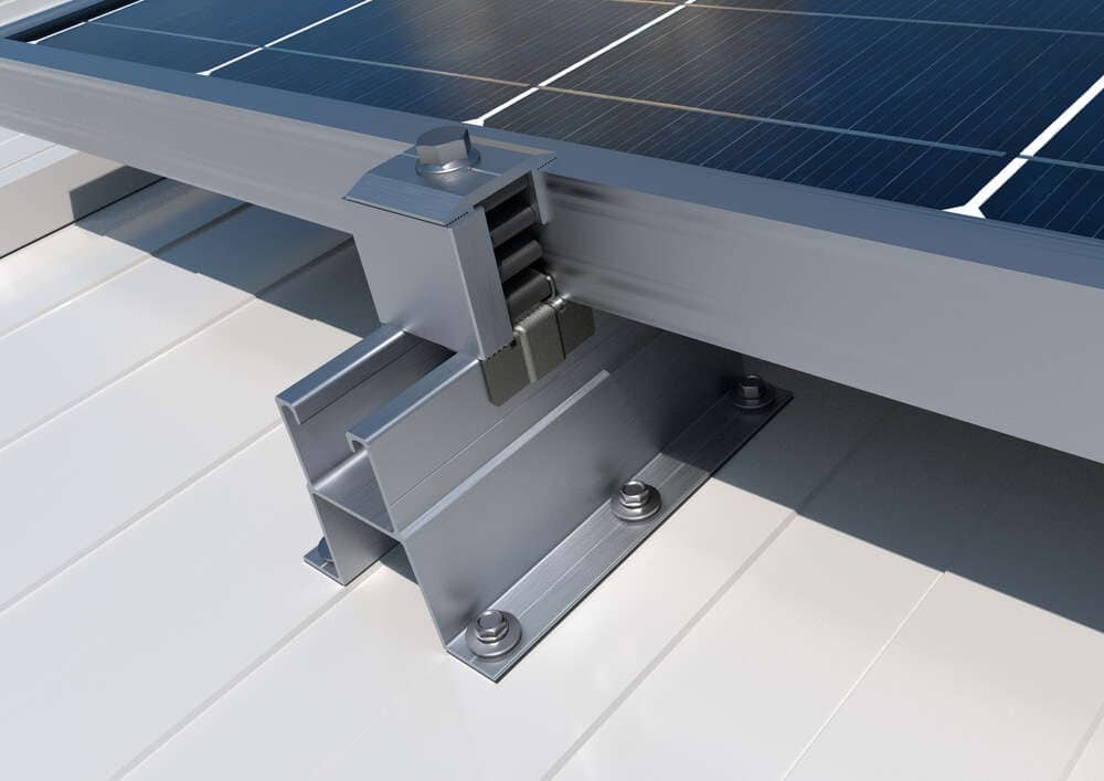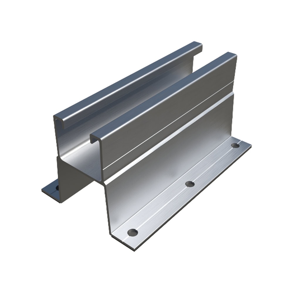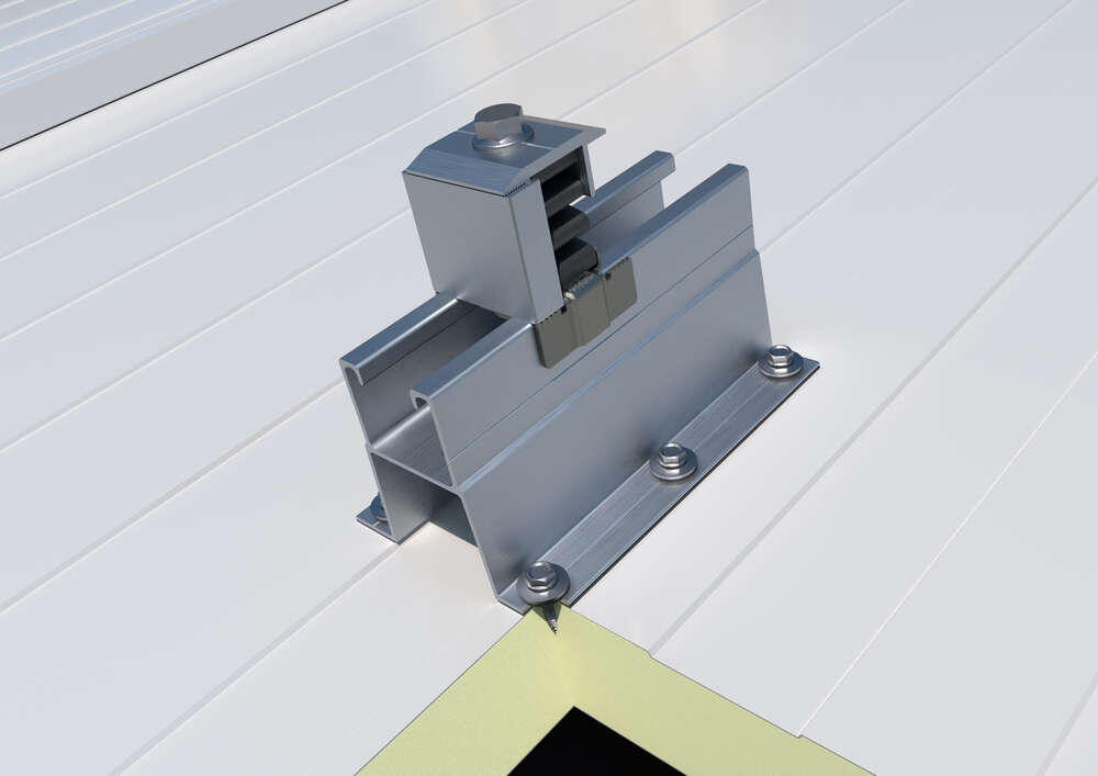 Perfil para montagem de painéis solares em telhados inclinados de chapa metálica ou painéis sandwich. É instalado de forma descontínua nos vales entre as nervuras. Pode ser utilizado para a montagem de estruturas coplanares. As suas asas têm orifícios para facilitar a instalação e incorporam tiras de EPDM para garantir a estanquidade. É fabricado em alumínio.