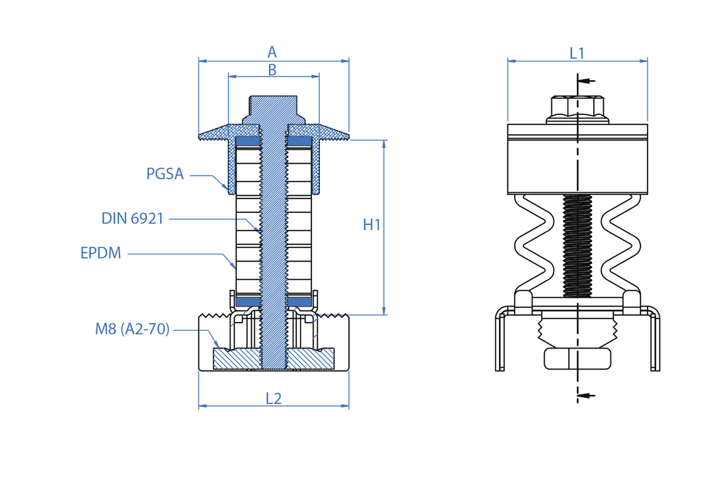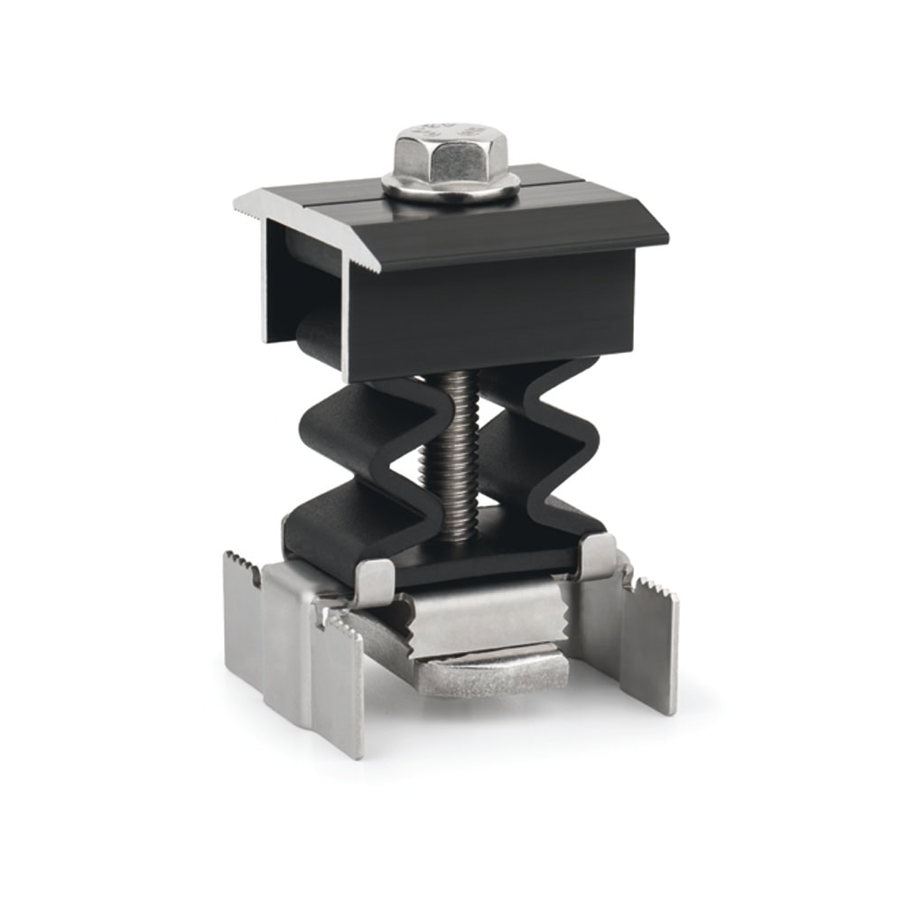 Grampo de fixação rápida para a instalação de painéis solares, de cor preta. Pode ser utilizado para a montagem de painéis tanto nas zonas intermédias como nas extremidades da instalação. Fixa os painéis por meio de pressão. É ajustável e compatível com quadros de painéis com uma altura entre 30 e 50 mm. O perfil de fixação é em alumínio anodizado, a mola é em EPDM e a porca, o parafuso e a ponte são em aço inoxidável A2.